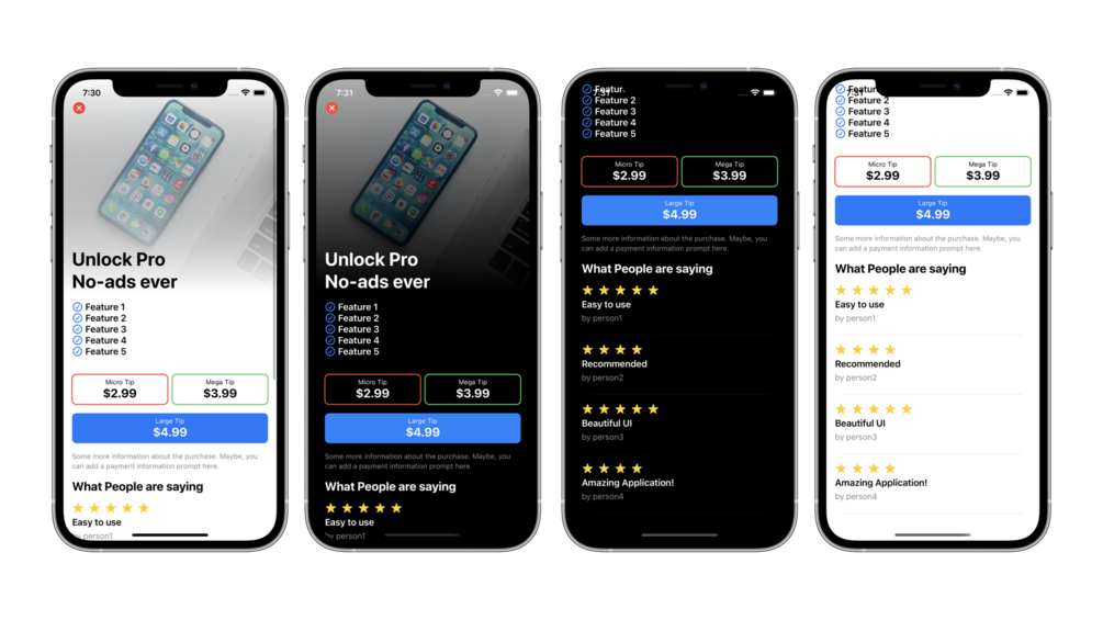 A gorgeous, fully ready to use SwiftUI paywall screen with full customisability. The project supports all of the major Apple Human Interface Guideline standards, and Apple accessibility features.